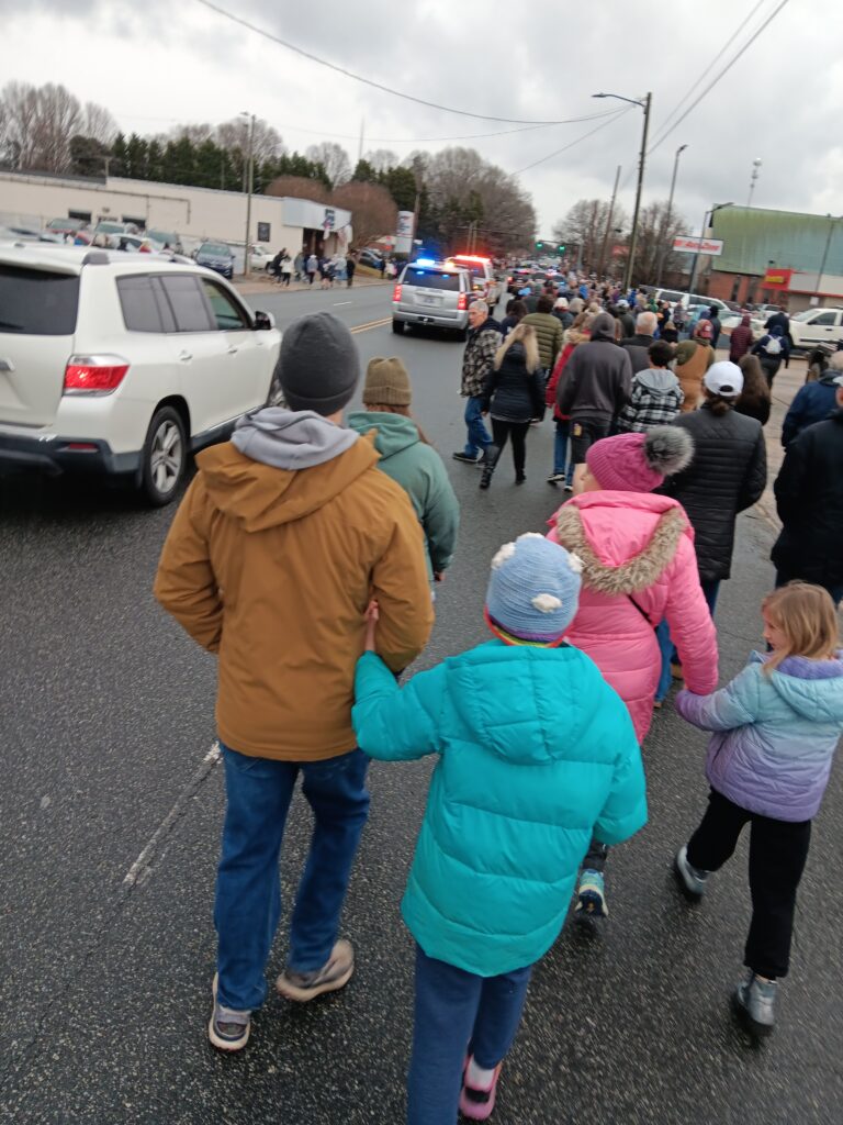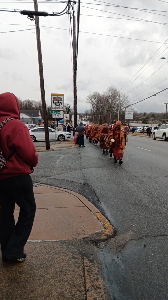 Hailey and I left Saturday afternoon and drove down to North Carolina. Sunday morning, we arrived in Greensboro, where the monks planned their lunch stop. Hundreds of people had already gathered, and more lined the streets leading into town. We walked toward the edge of town and waited with others to witness their arrival.