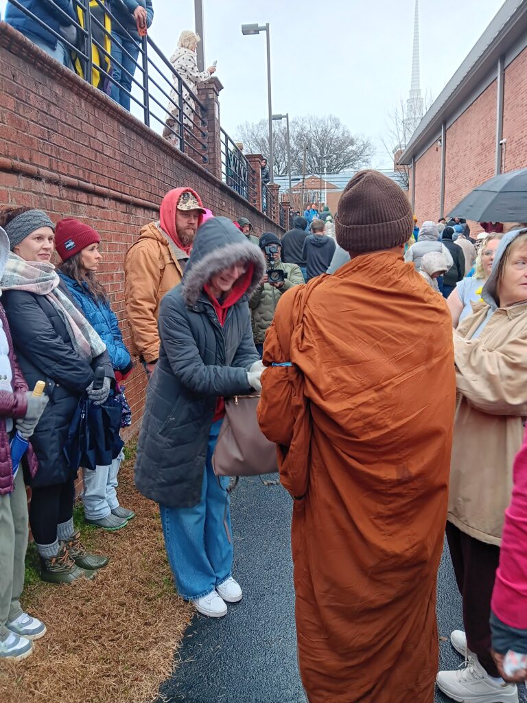 The monks then began passing out bracelets. Naturally, the crowd pressed forward, a sense of urgency rising even though the monks remained calm and slow. The lead monk asked people not to request individual photos because they were about to continue walking. Still, many asked.